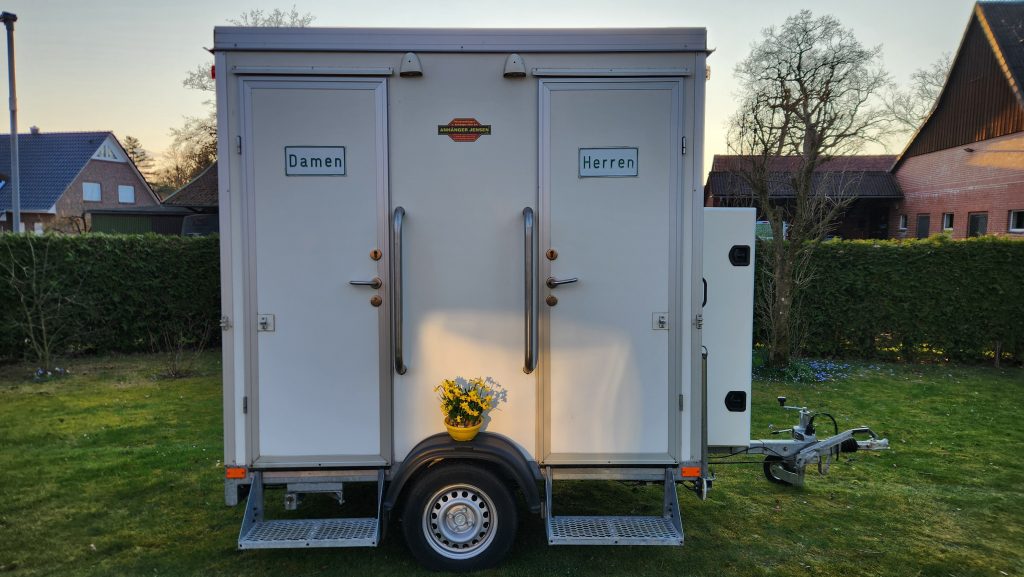 - Einachsiger Toilettenwagen mit zwei Kabinen, bei der eine davon zusätzlich mit einem Urinal ausgestattet ist